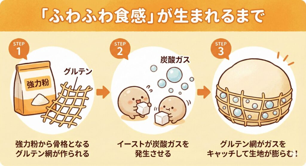 結論から言うと、食感の秘密は強力粉に含まれる「グルテン」と、ドライイーストという「酵母」の共同作業にあります。