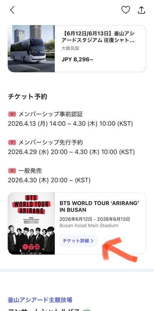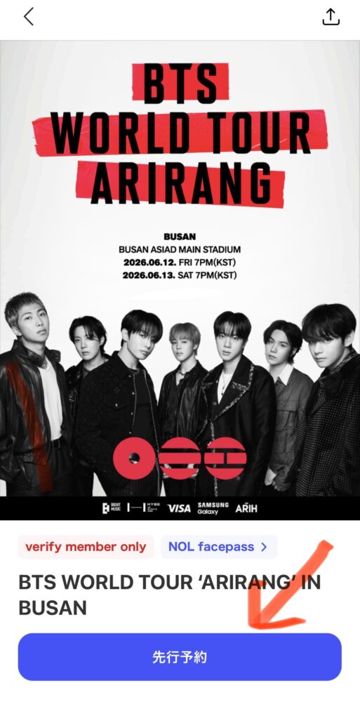 3. 「BTS WORLD TOUR ‘ARIRANG’ IN BUSAN」ページの「先行予約」ボタンをタップ。(上記右の画面)