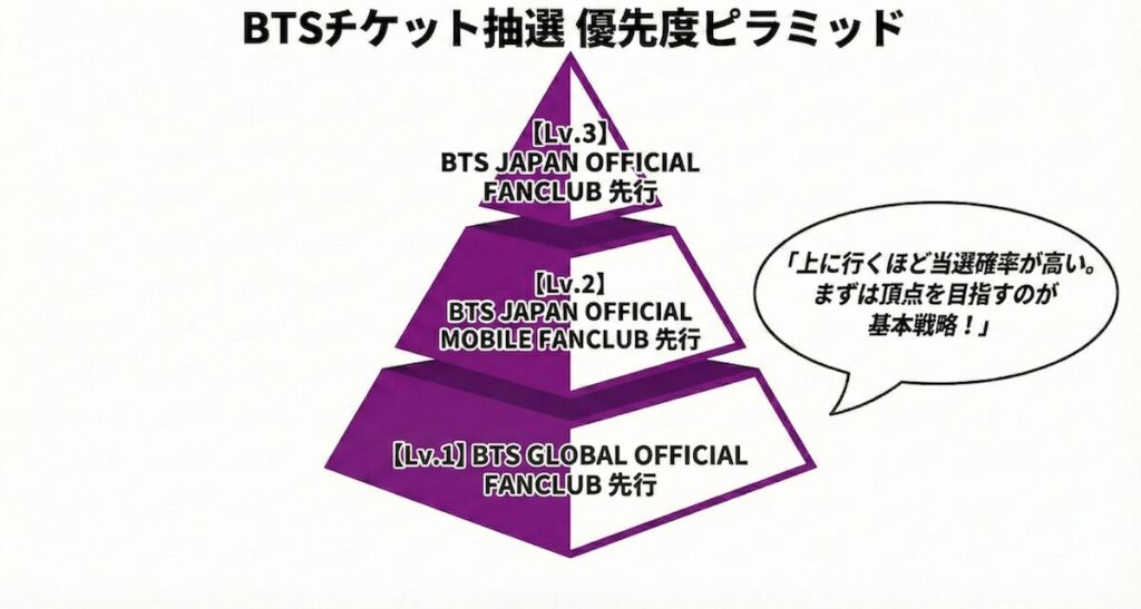 ポイント: ピラミッド図の底辺(Lv.1)にあたるのがここです。多くの人があきらめてしまうタイミングですが、Globalファンクラブ会員であればエントリー権があります。一般販売や機材開放席は「宝くじ以下の確率」となるため、自力でチケットを確保できる現実的なラインは、このGlobal先行までと考えておくのが賢明です。