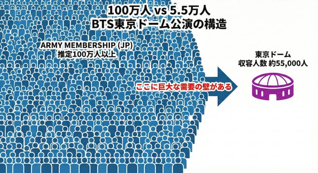 東京ドームの収容人数は約55,000人です。今回は2日間の公演が行われるので、総動員数は110,000人。一方で、BTSの日本におけるファンクラブ会員数は、公式発表こそないものの、数百万人規模とも言われています。つまり、チケットを手にできるのは、もともとごく一部の幸運なファンに限られる、というのが動かせない事実なのです。