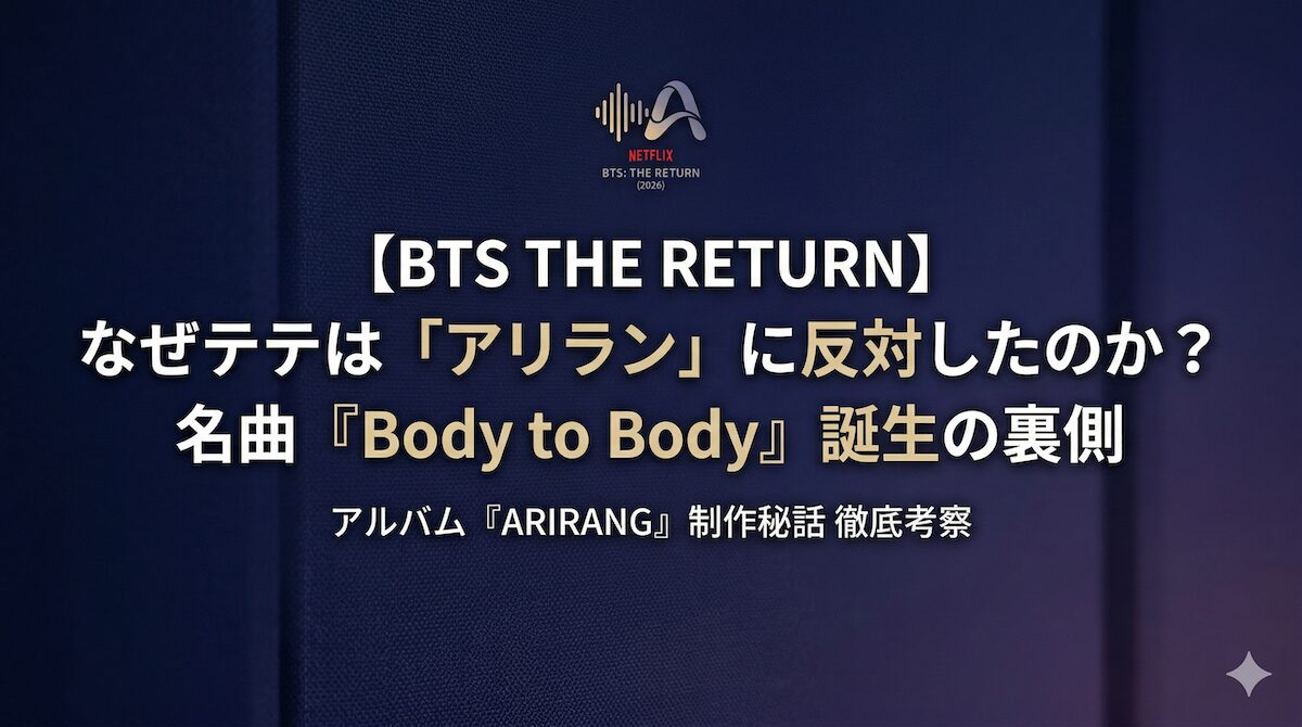 皆さん、Netflixで配信中のドキュメンタリー『BTS: THE RETURN』はもうご覧になりましたか?完全体でのカムバックに向けた熱い制作の裏側が描かれる中、ファンの間で最も話題になり、心をざわつかせたのが……新曲『Body to Body』の「アリラン」サンプリングを巡る、あの緊迫した会議のシーンですよね。