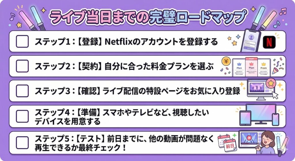 「Netflixで見れるのは分かったけど、具体的に何をすればいいの?」という方のために、ライブ当日までに行うべきことを5つのステップにまとめました。この通りに進めれば、誰でも簡単に準備が完了します。