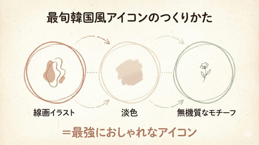 「センスがないから…」なんて思う必要は全くないよ。実は、今っぽい韓国風のおしゃれなアイコンには、誰でも真似できる共通の法則があるんだ。それは、次の3つの要素。
