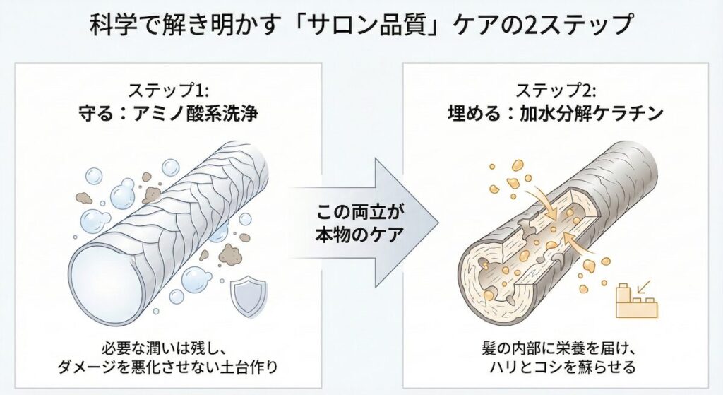 つまり、ルビアンロイヤルシャンプーの価値は、「優しい洗浄で髪を守り(保護)」、同時に「ケラチンで内部を埋める(補修)」という、サロン品質のケアに不可欠な2つの要素を両立させている点にあるのです。