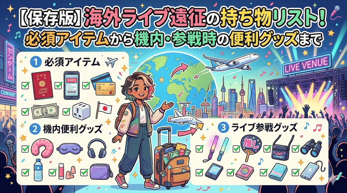 海を越えて「推し」に会いに行く海外ライブ遠征!チケットが取れた瞬間の喜びはひとしおですが、いざ出発が近づくと「忘れ物はないかな?」「機内に持ち込めないものは?」「現地の会場で困らない?」とパッキングに不安を感じることも多いですよね。
